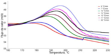 Los resultados presentados hasta el momento han sido obtenidos por aplicación de procedimientos para lo que es necesario obtener la entalpía total de reacción, DtotH, lo que supone la integración del área bajo la curva DSC asociado con la reacción de reticulación. En estudios isotérmicos para sistemas EVA/peróxido y SBS/peróxido se obtienen picos anchos y poco intensos, lo que da lugar a una alta dispersión de datos experimentales. El estudio para la determinación de parámetros cinéticos como energía de activación y factor de frecuencia en los procesos de descomposición del peróxido y formación de redes poliméricas son establecidas por condiciones dinámicas.21 Análisis cinético a partir de curvas dinámicas En la Figura 5, se presentan las curvas DSC obtenidas a diferentes velocidades de calentamiento, de las cuales se obtuvo el valor de la temperatura Tp y los valores de entalpía del pico que se atribuye a la reacción de curado. Puede observarse que la Tp se recorre a temperaturas más bajas conforme la velocidad de calentamiento disminuye en la mezcla adhesiva.