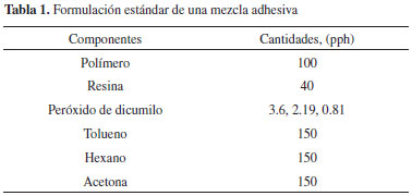 EXPERIMENTAL Materiales Copolímero estireno- butadieno (SBR) de estructura lineal al azar en bloque con un contenido de estireno total de 25% y un 17.5% de estireno en bloque en el copolímero, suministrado por Dynasol Elastómeros.4 Resina politerpene estirenada, comercialmente identificada como Piccolyte®HM106, con una temperatura de ablandamiento de 106 ºC y una viscosidad Brookfield® a 140 ºC de 4300 cP, suministrada por Pinova Inc.®.9 Resina éster de pentaeritritol, comercialmente identificada como Sylvalite® RE100L, con una temperatura de ablandamiento de 100 ºC y una viscosidad Brookfield a 150 ºC de 955 cP, suministrada por Arizona Chemical Inc®.10 Peróxido de dicumilo (PDC), suministrado por Retilox® Co.11 Los solventes utilizados fueron n-hexano, tolueno y acetona grado ACS, suministrado por Aldrich Chemical Co. Proceso de mezclado La mezcla adhesiva se llevó a cabo en un reactor de vidrio agitado mecánicamente con un equipo IKA EUROSTAR modelo RW16. El mezclado se desarrolló a temperatura ambiente por un periodo de dos horas, se realizó una formulación tipo para esta investigación, la cual se especifica en la Tabla 1 en donde se mantiene constante la cantidad de las resinas piccolyteHM106 y sylvaliteRE100L, variando la cantidad de peróxido de dicumilo, las cantidades de los componentes fueron establecidas en partes por cien de hule (pph).
