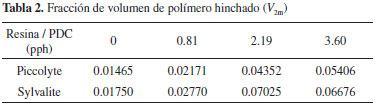 El factor V2m mostrado en la Tabla 2, el cual está relacionado con la densidad de entrecruzamiento, nos indica que para las mezclas adhesivas con la resina piccolyte HM106 el número de cadenas que no están incorporadas en la red sigue siendo mucho mayor en comparación a las mezclas con la resina sylvalite RE100L. Cabe mencionar que la adición tanto de las resinas como del agente de entrecruzamiento afectan este parámetro de fracción volumen ya que todos los valores para las mezclas adhesivas con resinas y agente de entrecruzamiento son mayores que la mezcla adhesiva con adhesivo basado en SBR.
