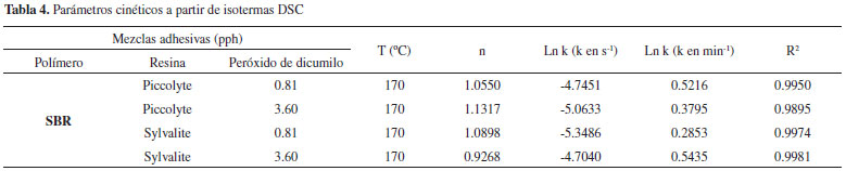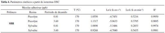 Mecanismo de reacción de entrecruzamiento de orden n En la Tabla 4 se muestran los parámetros de ajuste obtenidos para sistemas polímero/peróxido/resina estudiados, como lo es n y ln k, así como el cuadrado del coeficiente de correlación de ajuste (R2). Los valores encontrados para el orden de la reacción concuerdan con lo reportado por Brazier,20 esto es definido con coeficientes de correlación cercanos a la unidad.15,19