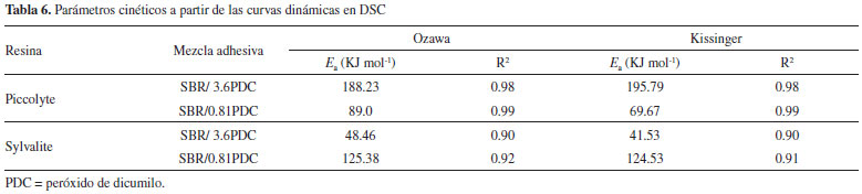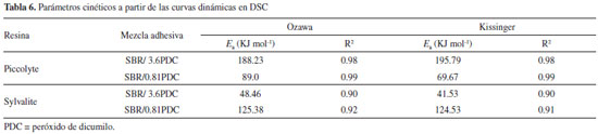 IDivisión de Estudios de Posgrado e Investigación, Instituto Tecnológico de Ciudad Madero, 89440, Ciudad Madero, Tamaulipas, México Recebido em 28/09/2014 *e-mail: jlriveraarmenta@itcm.edu.mx Curing is an important process in adhesive formulation, but scant reports on the study of the kinetics of curing in adhesive are currently available, particularly for formulations including styrene-butadiene copolymers. The focus of the present work was to thermodynamically quantify the curing reaction in pressure-sensitive adhesives (PSA) obtained from styrene-butadiene copolymers, the effect of dicumyl peroxide (DCP) ratio, which acts as a crosslinking agent, and also evaluate the effect of two reactive adhesive resins, sylvalite and piccolyte. Kinetic parameters were determined by differential scanning calorimetry (DSC) in an isothermic and dynamic mode, gel content was determined as was swelling degree, given these characteristics can be associated with the curing reaction. The kinetic study showed the curing reaction was first order, according to the Ozawa and Kissinger equation. Resins have affinity to BR segment, while in the case of sylvalite and piccolyte to the PS segment, varying behavior with dicumyl peroxide in the adhesive mixture. Lower swelling values were associated with an increase in crosslinking, indicative a curing reaction took place, and the gel content test was used to corroborate the results. INTRODUCCIÓN Recientemente, los copolímeros con bloques poliestirenicos han resultado ser materiales de elección en una gran variedad de aplicaciones en adhesivos. De manera particular, los adhesivos sensitivos a la presión (PSA) se pueden obtener con la adición de copolímeros dibloque, y otros ingredientes tales como resina adhesivas.1-3 Por otro lado, la compatibilidad de las resinas adhesivas en los copolímeros del tipo estireno-isopreno-estireno (SIS), estireno-butadieno aleatorizado (SBR), estireno-butadieno-estireno (SBS) y estireno-etileno-butadieno-estireno (SEBS), son compatibles al bloque intermedio o terminal del copolimero impartiendo diferentes propiedades viscoelásticas. Las resinas adhesivas influyen en el incremento de la Tg del bloque intermedio o del bloque terminal, dependiendo de su compatibilidad con cualquiera de los bloques y la compatibilidad de la resina adhesiva con el bloque intermedio disminuye el valor del módulo en la zona del plateau, lo cual genera la adhesividad del material. Las resinas adhesivas que son compatibles con ambos bloques ocasionan un incremento en la Tg del bloque intermedio y disminuyen la Tg del bloque terminal dependiendo del peso molecular y la Tg de las resinas adhesiva. Los elastómeros tipo estireno-butadieno (SBR) tienen una gama de aplicación en adhesivos debido a su desempeño en un rango de temperaturas amplio, lo que permite orientarlos aplicaciones adhesivas en cintas, etiquetas, embalaje, adhesivos no tejidos, adhesivos industriales, edificio, construcción, etc. El desempeño de adhesivos que utilizan SBR en su formulación depende de factores como el contenido de estireno, tipo de estructura (radial o lineal), viscosidad, entre otros.4 Algunos estudios en adhesivos sensitivos a la presión que contienen copolímeros en bloques han sido reportados,5-7 en los estudios se discuten: el efecto del sustrato y las resina adhesivas en las fuerzas de despegue para adhesivos hot melt (HM) con SIS,5 y el efecto de los SIS en adhesivos PSA mezclados con resina adhesivas como diciclopentadieno hidrogenadas (H-DCPD),6 así como el estudio de copolímeros con etilen vinil acetato (EVA) en adhesivos hot melt sensitivos a la presión HMPSAs.7,8 Sin embargo, de los reportes existentes no existe información sobre el estudio de la reacción de curado empleando copolímeros base estireno-butadieno, por lo que en el presente trabajo se reporta la evaluación térmica de la reacción de curado empleando como agente de curado peróxido de dicumilo en adhesivos formulados a partir de elastómeros estireno-butadieno (SBR).