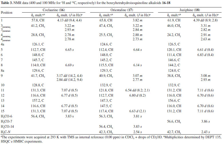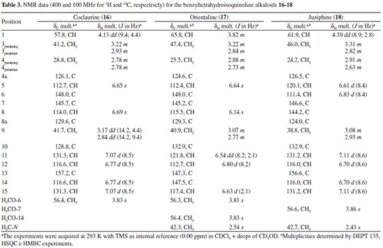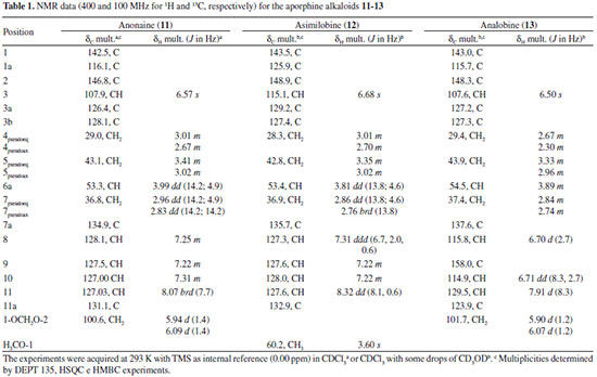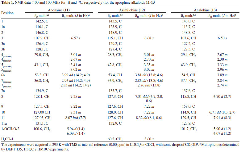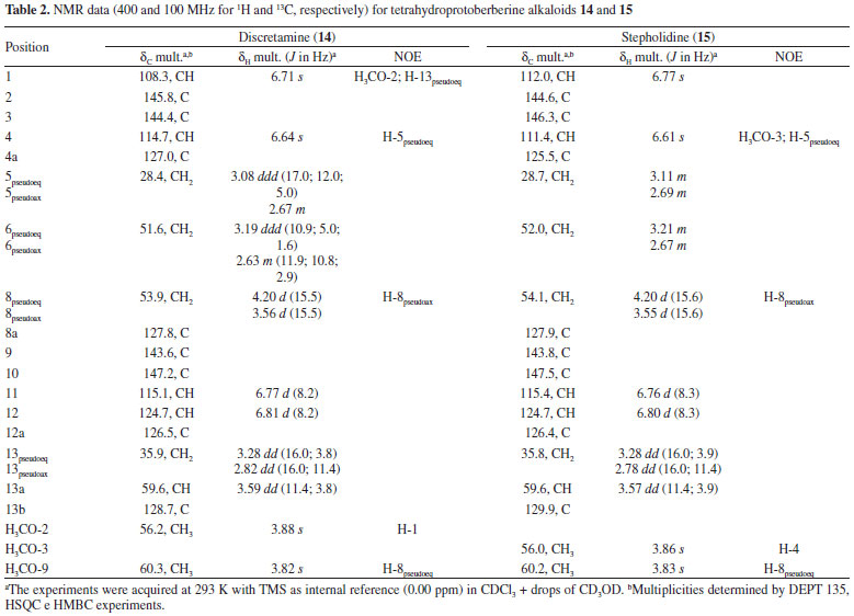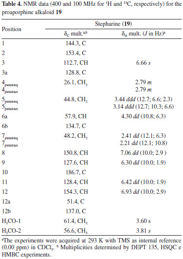 RESULTS AND DISCUSSION Once a time the crude extracts of the stem bark of A. pickelii were found to have antimicrobial and antioxidant activities (Table 5), they were subjected to successive chromatographic separations as described in the Experimental leading to the isolation and identification of 20 chemical constituents, being four steroids (1-4), three lignans (5-7), six aporphinoid alkaloids (8-13), two tetrahydroprotoberberine alkaloids (14-15), three benzyltetrahydroisoquinoline alkaloids (16-18), one proaporphine alkaloid (19), and one benzenoid (20) (Figure 1). Compounds 2, 5-8, 10 and 13 were recently described in the leaves of this species,13 while the other compounds are described here for the first time in this species. All compounds were identified by comparing their spectrometric data with those reported in the literature, as well as, extensive analysis of NMR data as β-sitostenone (1),16,17 β-sitosterol (2),16,17 stigmasterol (3),16,17 campesterol (4),16,17 eudesmin (5),13,18 magnolin (6),13,18 yangambin (7),13,19 liriodenine (8),9-11,13 atherospermidine (9),9-11 lysicamine (10),26-30 and 2-methoxybenzoic acid (20).24 Although, as the alkaloids 11-19 have been described a long time ago, their 1H and 13C NMR data are incomplete and showed ambiguities according to literature data. In this work, the complete and unequivocal 1H and 13C NMR data were revised according to 1D and 2D NMR experiments (Tables 1-4). Compound 11 displayed two spin system in the 1H NMR spectrum which is characteristic of aporphine alkaloids, one consisting of the signals at δ 2.67 and δ 3.01 (1H each, m, H-4) and δ 3.02 and δ 3.41 (1H each, m, H-5), and the other comprising the signals at δ 3.99 (1H, m, H-6a) and δ 2.83 and δ 2.96 (1H each, m, H-7). The singlet at δ 6.57 (1H, H-3) indicated a 1,2,3,4,5-pentasubstituted benzene ring, while the other aromatic signals revealed any substitution on the D ring (Table 1). The location of the methylenedioxy at C-1 and C-2 were established on the basis of the long-range 1H-13C correlation map from HMBC NMR experiment. In this, the hydrogens at δ 6.57 (H-3) as well as the methylenedioxy hydrogens showed correlation with the carbons at δ 142.5 (C-1) and δ 146.8 (C-2). The overall analysis of 1D and 2D NMR data enable the complete and unequivocal 1H and 13C NMR chemical shifts assignments (Table 1). Compound 12 presented 1H and 13C{1H} NMR spectra very similar to those of 11. However, in this case, the methylenedioxy signals were replaced by signals suggesting the presence of a methoxyl and hydroxyl groups at C-1 and C-2. The location of the methoxyl group at C-1 was established on the basis of the long-range 1H-13C correlation map from HMBC NMR experiment. In this, the hydrogen at δ 6.68 (H-3) as well the methoxyl hydrogens at δ 3.60 showed strong correlation with the carbon at δ 143.5 (C-1) (Table 1). Compound 14 showed several signals in the aliphatic region of 1H NMR spectrum that along with 1H-1H correlation map from COSY NMR experiment revealed three spin systems, which are typical for tetrahydroprotoberberine alkaloids (Table 2). The signals at δ 3.82 and δ 3.88 (3H each, s) indicated the presence of two methoxyl groups in the structure. Furthermore, the 1H NMR spectrum exhibited two signals at δ 6.71 (1H, H-1) and d 6.64 (1H, H-4), indicating a 1,2,4,5-tetrasubstituted benzene ring and two doublets at δ 6.81 (1H, J 8.2 Hz, H-12) and δ 6.77 (1H, J 8.2 Hz, H-11) suggesting a 1,2,3,4-tetrasubstituted benzene ring. The complete assignments of the 1H and 13C NMR chemical shifts were established on basis of one-bond and long-range 1H-13C NMR correlation experiments and 1D experiments (Table 2). In this, the hydrogen at δ 6.64 (H-4) and the methoxyl hydrogens at δ 3.88 showed long-range 1H-13C correlation with the carbon at δ 145.8 (C-2), while the hydrogen at δ 6.77 (H‑11) and the methoxyl hydrogens at δ 3.82 showed long-range 1H-13C correlation with the carbon at δ 143.6 (C-9). The hydroxyl groups at C-3 and C-10 were established on the basis of the long-range 1H-13C correlations of hydrogen at δ 6.71 (H-1) with the carbon at δ 144.4 (C-3) and the hydrogen at δ 6.81 (H-12) with the carbon at δ 147.2 (C-10), that showed any correlation with the methoxyl groups (Table 2). Moreover, the selective irradiation of the resonance frequency of the methoxyl hydrogens at δ 3.88 caused a NOE enhancement in the signal at δ 6.71 (H-1), while the selective irradiation of the resonance frequency of the methoxyl hydrogens at δ 3.82 caused a NOE intensification in the signal at δ 4.20 (H-8 pseudoequatorial) (Table 2). Compound 15 showed 1H and 13C{1H} NMR spectra very similar to those of 14. However, in this case, the hydrogen at δ 6.77 (H-1) as well as the methoxyl hydrogens at δ 3.86 showed 1H-13C long-range correlation with the same carbon at δ 146.3 (C-3), while the hydrogen at δ 6.61 (H-4) showed 1H-13C long-range correlation with the carbon at δ 144.6 (C-2), that showed any correlation with methoxyl groups. Thus, the methoxyl group at C-1 in 14 was replaced by a hydroxyl group in 15. In addition, the selective irradiation of the resonance frequency of the methoxyl hydrogens at δ 3.86 showed a NOE intensification in the signal of H-4 at δ 6.61 and any enhancement in the signal of H-1 at δ 6.77. The overall NMR data are described in (Table 2). Compounds 13 and 16 were obtained in a mixture once its NMR data indicated the presence of two set of signals with different ratios. The first set of signals in the 1H NMR spectrum displayed two spin system characteristic of aporphine alkaloids at δ 2.30 and δ 2.67 (H-4), δ 2.96 and δ 3.33 (H-5), δ 3.89 (H-6a) and δ 2.84 and δ 2.74 (H-7) (Table 1). The singlet at δ 6.50 (1H, H-3) indicated a 1,2,3,4,5-pentasubstituted benzene ring and the spins system at δ 6.70 (1H, d, J 2.7 Hz, H-8), 6.71 (1H, dd, J 8.3 and 2.7 Hz, H-10) and 7.91 (1H, d, J 8.3 Hz, H-11), indicating a 1,2,4-trisubst