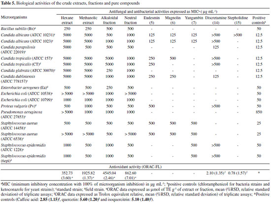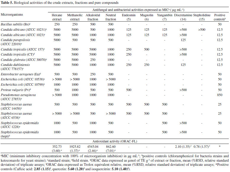 Mixture of 2-Methoxybenzoic acid (20) and liriodenine (8): Mixture of yellow and white needles (CH2Cl2:MeOH 3:1); identified by comparison with literature data (1H and 13C NMR).9-11,20-22 Antifungal and antibacterial activities (in vitro) Crude extracts, fractions and isolated compounds were evaluated for antifungal and antibacterial activities using the broth microdilution method (96-well microtiter plates), as previously described by Salvador et al.23 in the concentration of 12 to 5000 µg mL-1. The minimal inhibitory concentration (MIC) was the lowest concentrations that completely inhibit a tested strain. In these assays, chloramphenicol and ketoconazole were used as positive controls, while a DMSO solution in distilled water (5:95, v/v) was the negative control. Each assay was performed in duplicate for each microorganism evaluated and repeated three times. The strains of microorganisms utilized are shown in Table 5.