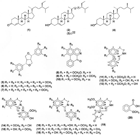 EXPERIMENTAL General procedures GC-MS analyses were performed on a Shimadzu QP5050A GC-MS system equipped with an AOC-20i auto-injector, and an Rtx®-5Sil MS fused capillary chromatography column (30 m x 0.25 mm x 0.25 µm film thickness) coated with 5%-diphenyl-95%-dimethylpolysiloxane. MS analysis were taken at 70 eV with a scan interval of 0.5 s and fragments from 40-500 Da. LR-ESI-MS were obtained in the positive ion mode on an ultra-high performance Waters Acquity UHPLC-TQD LC-MS system, equipped with an ESI source. 1D and 2D NMR data were acquired at 303 K in CDCl3 or CDCl3 plus some drops of CD3OD on a Bruker AVANCE III 400 NMR spectrometers, operating at 9.4 Tesla, observing 1H and 13C at 400.13 and 100.61 MHz, respectively. The spectrometer was equipped with a 5-mm multinuclear direct detection probe with z-gradient. One-bond and long-range 1H-13C correlation from HSQC and HMBC NMR experiments were optimized for an average coupling constant 1JH,C and LRJH,C of 140 and 8 Hz, respectively. All 1H and 13C NMR chemical shifts (δ) are given in ppm related to the TMS signal at 0.00 ppm as internal reference, and the coupling constants (J) in Hz. Silica gel 60 (70-230 mesh) was used for column chromatography, while silica gel 60 F254 was used for analytical (0.25 mm), and preparative (1.00 mm) TLC. Compounds were visualized by exposure under UV254/365 light and spraying of p-anisaldehyde reagent followed by heating on a hot plate, and Dragendorff's reagent. Botanical material The stem bark of Annona pickelii were collected at 'Mata do Crasto', in the city of Santa Luzia do Itanhy [coordinates: 11º 23' 01" S, 37º 25' 13" W], Sergipe, Brazil, in March 2010. The identity of the plant was confirmed by Dr. A. P. N. Prata, Department of Biology, Sergipe Federal University (UFS), Brazil, and a voucher specimen (#15442) has been deposited in the Herbarium of Sergipe Federal University (ASE/UFS). Extraction and isolation Dried at room temperature and powdered stem bark of A. pickelii (790 g) was successively extracted with n-hexane (2.5 L, five times) followed by MeOH (2.5 L, five times), yielding hexane (5.53 g) and MeOH (129.32 g) extracts, after solvent removal under reduce pressure. An aliquot of the hexane extract (5.0 g) was initially subjected to silica gel column chromatography (CC) eluted with increasing concentrations of CH2Cl2 in n-hexane (0 to 100, v/v), followed by EtOAc in CH2Cl2 (0 to 100, v/v), and MeOH in EtOAc (0 to 70, v/v), affording 177 fractions (25 mL each), that were pooled in 23 groups (G1 to G23), according to TLC analysis. Group G17 (446.0 mg) eluted with CH2Cl2-EtOAc (80:20, v/v), was submitted to a new silica gel CC eluted with increasing concentrations of CH2Cl2 in n-hexane (0 to 100, v/v) followed by EtOAc in CH2Cl2 (0 to 100, v/v), giving 201 fractions (each 20 mL) that were pooled in 31 groups (G17.1 to G17.31), according to TLC analysis. Groups G17.6 to G17.8 were also pooled (213.0 mg) and submitted to preparative TLC eluted with n-hexane-EtOAc (80:20, v/v, two times), affording 1 (5.3 mg) and a mixture of 2, 3 and 4 (48.9 mg). Group G18 (346.0 mg) eluted with CH2Cl2-EtOAc (70:30, 60:40 and 50:50, v/v) was submitted to a new silica gel CC eluted with the same eluent system as described for initial CC, yielding 78 fractions (25 mL each), that were subsequently pooled into 14 groups (G18.1 to G18.14). Group G18.10 (76.1 mg) was submitted to preparative TLC eluted with n-hexane-EtOAc (95:05, v/v, four times), giving 5 (4.3 mg), 6 (27.4 mg), and 7 (20.1 mg). TLC investigations indicated a high concentration of alkaloids in the MeOH extract. Therefore, an aliquot of this extract (120.0 g) was initially subjected to an acid-base extraction to give alkaloid (0.68 g) and neutral (3.04 g) fractions.15 An aliquot of alkaloid fraction (0.60 g) was submitted to silica gel CC previously treated with a 10% NaHCO3 solution,15 and eluted with increasing concentrations of CH2Cl2 in n-hexane (0 to 100, v/v), followed by EtOAc in CH2Cl2 (0 to 100, v/v), and MeOH in EtOAc (0 to 50, v/v), giving 130 fractions (15 mL each), that were pooled in 12 groups (G1 to G12), according to TLC analysis. Group G4 (195.0 mg) eluted with CH2Cl2 (100%) and CH2Cl2-EtOAc (95:05 and 90:10, v/v) was submitted to a new silica gel CC eluted with increasing concentrations of CH2Cl2 in n-hexane (0 to 100, v/v) followed by MeOH in CH2Cl2 (0 to 50, v/v), affording 27 fractions (25 mL each) that were subsequently pooled into 5 groups (G4.1 to G4.5). Group G4.2 (29.9 mg) was submitted to preparative TLC eluted with CH2Cl2-MeOH (95:05, v/v, two times) yielding a mixture of 8 and 20 (3.1 mg) and 11 (18.3 mg). Group G6 (27.3 mg) eluted with EtOAc (100%) was also submitted to preparative TLC eluted with CH2Cl2-MeOH (95:05, v/v, two times) giving 14 (4.8 mg) and 15 (9.5 mg), respectively. Group G7 (128.8 mg) eluted with EtOAc-MeOH (95:05, v/v) was submitted to a new silica gel CC eluted with increasing concentrations CH2Cl2 in n-hexane (0 to 100, v/v) followed by MeOH in CH2Cl2 (0 to 100, v/v) resulting in 38 fractions (25 mL each), that were subsequently pooled into 7 groups (G7.1 to G7.7). Group G7.2 (58.8 mg) was submitted to preparative TLC eluted with CH2Cl2-MeOH (90:10, v/v, three times) yielding a mixture of 12 and 16 (9.9 mg), and a mixture of 17 and 18 (6.1 mg). Group G8 (50.2 mg) eluted with EtOAc-MeOH (95:05 and 90:10, v/v) was subjected to a new silica gel CC eluted with increasing concentrations of CH2Cl2 in n-hexane (0 to 100, v/v) followed by MeOH in CH2Cl2 (0 to 100, v/v) resulting in 30 fractions (20 mL each) that were pooled into 7 groups (G8.1 to G8.7). Groups G8.3 and G8.4 were also pooled (21.0 mg) and submitted to preparative TLC eluted with CH2Cl2-MeOH (90:10, v/v, two times) yielding a mixture of 8, 9 and 10 (7.4 mg), 8 (2.7 mg), 12 (5.1 mg), and 19 (1.7 mg), respectively. β-sitostenone (1) and Mixture of β-sitosterol (2), stigmasterol (3) and campesterol (4): white needles; identifie