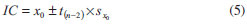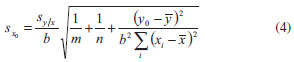 O intervalo de confiança, IC, para x0w pode ser calculado pela Equação (13): ![]() A forma geral dos intervalos de confiança para uma concentração calculada é mostrada na Figura 2.