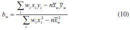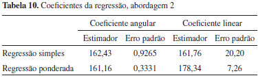 Os coeficientes para a regressão simples e ponderada e seus respectivos erros padrão (bem menores, mais confiáveis, para a regressão ponderada) pela variância estão descritos na Tabela 10.