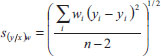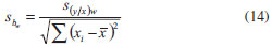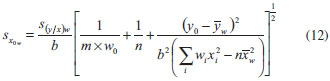 Os coeficientes da curva analítica devem ser estimados para dar peso adicional aos pontos onde as barras de erro são menores, ou seja, é mais importante que a reta ajustada passe mais próxima aos pontos de menor erro. Com isso, os pontos iniciais da curva, menores desvios padrão, ficam mais bem ajustados do que os pontos finais da curva, maiores desvios padrão. Assim sendo, o peso atribuído a cada ponto diminui com a concentração e deve ser inversamente proporcional a sua variância, si2, ou seja, o peso será maior quando a variância for menor. Se os pontos individuais da curva analítica são considerados (x1,y1), (x2,y2), etc., e os desvios padrão correspondentes são s1, s2, etc., então os pesos individuais, w1, w2, etc., são dados pela Equação (6): ![]() onde si-2 = 1/si2 . Ao utilizar o divisor n no denominador da Equação (6), os pesos foram dimensionados de modo a que a sua soma seja igual ao número de pontos no gráfico. A utilização da equação (6), baseada nas variâncias experimentais, seria excelente caso as variâncias fossem conhecidas ou obtidas de forma bastante confiável, porém, isso requer uma quantidade muito grande de repetições, para minimizar o efeito do caráter não linear. Uma estratégia para minimizar este efeito, não disponível na literatura, é encontrar uma função que relacione a variância com os valores de y. A função indicada para modelar variâncias é uma função do tipo potência, genericamente y = axib, que para este caso específico toma a forma da Equação (7), por deixar resíduos menores: ![]() A aplicação do logaritmo lineariza a função potência, Equações (8) e (9): ![]() ![]() nas quais os coeficientes da regressão são: a = κ1; b = κ2. Desse modo, os pesos w1 são estimados por meio do ajuste da equação (9) e posterior utilização da equação (6). Os coeficientes angular e linear da curva de regressão ponderada são, então, dados pelas Equações (10) e (11), respectivamente: ![]() ![]() Nestas equações O desvio padrão de uma concentração prevista por esta regressão ponderada, Sx0w, pode ser calculado pela Equação (12):11 ![]()