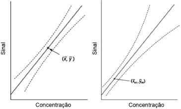 De uma maneira geral, a comparação dos resultados dos cálculos de regressão simples e ponderada é muito instrutiva. Os efeitos do processo de ponderação são claros. O centroide ponderado é muito mais próximo da origem do gráfico que o centroide não ponderado devido ao peso maior atribuído aos pontos mais próximos à origem (pontos de menor variância). A inclinação e o intercepto da curva com ajuste ponderado são muito semelhantes aos da curva com ajuste não ponderado, por isso os resultados das concentrações são obviamente similares entre as duas abordagens. O que diferencia um modelo do outro é a precisão dos intervalos de confiança, principalmente para baixas concentrações e a principal vantagem do modelo linear ponderado é a obtenção de intervalos mais precisos para baixas concentrações. Apesar de envolver uma matemática um pouco mais complexa, a regressão linear ponderada é uma ferramenta muito útil e seu uso deve ser encorajado.