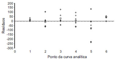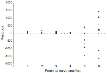 A segunda proposição nem sempre é atendida, pois é muito comum que a precisão de y varie com a concentração e o mais indicado nesses casos seria empregar uma regressão ponderada pela variância, o que significa dar peso maior aos pontos de menor concentração e maior precisão. Teste de homogeneidade dos resíduos Muitas vezes, os erros da regressão linear não possuem variância constante, chamado comportamento heterocedástico. Desse modo, os parâmetros da curva obtidos por meio de uma regressão linear simples, na qual todos os pontos possuem a mesma influência, não são os mais adequados. A hipótese de homocedasticidade pode ser verificada tanto pela avaliação visual dos resíduos quanto por meio de testes estatísticos. O teste empregado nesse trabalho para diagnóstico da homocedasticidade dos erros, raramente discutido em Química Analítica, é o teste de Goldfeld-Quandt.8 No presente trabalho, a causa da heterocedasticidade está na dependência da precisão com a concentração, em outras palavras, a variância em y aumenta com a concentração. Os métodos mais utilizados para verificar a hipótese de igualdade das variâncias são os testes de Cochran, Bartlett e Levene. Dentre esses, o mais comum é o teste de Cochran,9 que é aplicado apenas quando todos os desvios padrão são obtidos a partir de um mesmo número de resultados em condições de repetibilidade. O teste de Cochran é um teste unicaudal, aceito depois de verificar a uniformidade da regressão e comparar a maior variância com as demais. O teste consiste em calcular Ccalculado e comparar com Ctabelado, Equação (1). Se a repetibilidade das medidas é independente do valor da concentração, esta condição de variância uniforme é chamada homocedástica, e quando não uniforme, heterocedástica. ![]() na qual: s2máx= maior variância; si2 = variância amostral. Os testes de Bartlett e Levene também são largamente utilizados. Esses testes são testes bicaudais e o método proposto por Bartlett tem um comportamento melhor quando os dados seguem uma distribuição normal. Regressão linear simples Nos casos onde os erros presentes no eixo x são desprezíveis em relação aos do eixo y, busca-se o melhor ajuste que minimiza os desvios no eixo y entre os pontos experimentais e os valores previstos pelo modelo. Uma vez que alguns desses desvios (tecnicamente conhecidos como os resíduos em y) são positivos e outros negativos, é sensato minimizar a soma dos quadrados dos resíduos, uma vez que estes quadrados passam a ser positivos. Isso explica o uso frequente do termo método dos mínimos quadrados para o procedimento. A reta necessária é calculada sobre esse princípio e deve passar pelo centroide dos pontos, ( Os coeficientes angular e linear da regressão podem ser calculados pelas Equações (2) e (3), respectivamente: ![]() ![]() É importante observar que os valores experimentais e os valores previstos pelo modelo de regressão não são exatamente iguais. O desvio padrão da concentração associado à regressão pode ser calculado pela Equação (4):9 ![]()