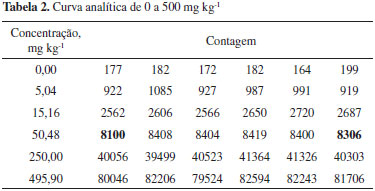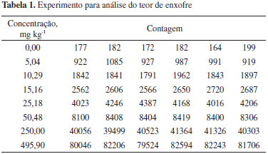 RESULTADOS E DISCUSSÃO Os dados foram tratados de duas maneiras distintas, a fim de avaliar a abordagem mais adequada, voltada à concentração de interesse: 10 mg kg-1. A primeira abordagem segue a orientação da norma ASTM D7039-13, com a construção da curva analítica de 0 a 500 mg kg-1. A segunda abordagem propõe a construção de uma curva analítica de menor extensão, de 0 a 50 mg kg-1. Nas duas abordagens, este trabalho considera a regressão simples e ponderada. Abordagem 1: Curva analítica com os pontos recomendados pela ASTM D7039-13 Os resultados da construção da curva analítica, de acordo com a norma ASTM D7039-13, estão apresentados na Tabela 2.