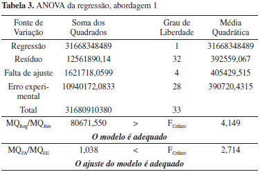 Os valores em negrito foram excluídos do conjunto de dados por serem considerados pontos anômalos segundo o teste de Grubbs para duplas e os resíduos apresentam comportamento independente, segundo o teste de Durbin-Watson.11 A ANOVA da regressão indica que o ajuste linear é o mais adequado, Tabela 3.