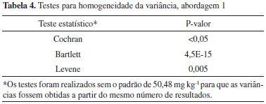 O teste de Goldfeld-Quandt8 consiste inicialmente em ordenar as observações de acordo com a variável explicativa. Em seguida, é escolhido um número central de observações, k, a ser omitida de tal forma que contenha aproximadamente 20% dos dados e que os outros dois grupos, parte 1 e parte 3, tenham quantidades semelhantes de observações. Quando o número de observações restantes é ímpar, a parte 3 fica com uma observação a mais. Esses dois grupos restantes são ajustados pelo método dos mínimos quadrados ordinários, separadamente. Dado que S1 e S3 sejam as somas dos quadrados dos resíduos obtidos nas regressões, parte 1 e parte 3, respectivamente, testa-se a hipótese de que a variância dos erros em ambas as regressões sejam iguais. Para isso, calcula-se a estatística R, Equação (14): ![]() Com os seguintes graus de liberdade: (n3 - (m + 1); n1 - (m + 1), na qual: n = número de observações = 34; n3 = número de observações na parte 3 = 14; n1 = número de observações na parte 1 = 13; m = número de variáveis explicativas, somente a concentração =1. Com um nível de significância de 0,05 %, rejeita-se a hipótese nula, se S3 for maior que S1. Abordagem 1: Com 34 observações, o valor de k é aproximado para 7, 34 × 0,20 = 6,8, deixando a parte 1 com 13 observações e a parte 3 com 14. A estatística R é: R = 438/0,86 = 508 Para 12 e 11 graus de liberdade, o valor p obtido é 2,75E-13. Portanto, rejeita-se a hipótese nula com 0,05% de confiança. Abordagem 2: Com 34 observações, o valor de k é aproximado para 7, deixando a parte 1 com 13 observações e a parte 3 com 14. A estatística R é: R = 5,70/0,87 = 6,53 Com 12 e 11 graus de liberdade, o valor p obtido é 0,0020. Portanto, rejeita-se a hipótese nula com 0,05% de confiança. A mesma conclusão é obtida por meio dos testes estatísticos descritos na Tabela 4, na qual P-valores menores do que o nível de significância de 0,05 indicam rejeição da hipótese de homogeneidade das variâncias. Assim sendo, a regressão linear ponderada pela variância é o modelo mais adequado.