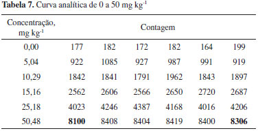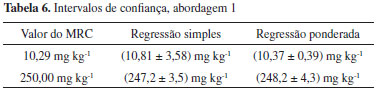 A partir de então, é possível calcular os intervalos de confiança para as regressões simples, Equações (4) e (5), e ponderada, Equações (12) e (13), para concentrações em torno de 10 mg kg-1, utilizando-se os valores de contagem (sinal) da Tabela 1. O material de referência certificado (MRC) utilizado tem concentração de 10,29 mg kg-1. A fim de se entender melhor e ratificar a pesquisa bibliográfica a respeito destas duas abordagens, decidiu-se realizar esta mesma análise para outra concentração, mais elevada, de 250 mg kg-1. Foram realizadas seis repetições para cada MRC e não foram encontrados valores anômalos para esses conjuntos segundo o teste de Grubbs, então, os cálculos para o desvio padrão e o intervalo de confiança da previsão foram efetuados a partir de suas médias, com m = 6 e n = 34. Estes resultados estão disponíveis na Tabela 6.