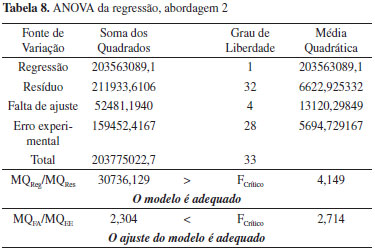 Os valores em negrito foram excluídos do conjunto de dados por serem considerados pontos anômalos segundo o teste de Grubbs para duplas e os resíduos apresentam comportamento independente, segundo o teste de Durbin-Watson.11 A ANOVA da regressão indica que o ajuste linear é o mais adequado, Tabela 8.