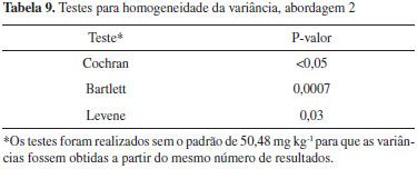O diagnóstico de heterogeneidade também é obtido quando se utilizam os testes estatísticos para avaliar a variância dos dados, conforme Tabela 9, na qual P-valores menores do que o nível de significância de 0,05 indicam rejeição da hipótese de homogeneidade das variâncias. Assim sendo, a regressão linear por mínimos quadrados ponderados é mais adequada.