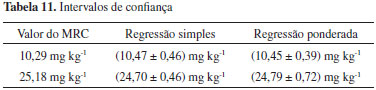 Novamente, é possível calcular os intervalos de confiança para as regressões simples, Equações (4) e (5), e ponderada, Equações (12) e (13), para concentrações em torno de 10 mg kg-1, utilizando-se os valores de contagem (sinal) da Tabela 1. Além do MRC de 10,29 mg kg-1, outro de 25 mg kg-1 também foi avaliado pelos dois modelos. Foram realizadas seis repetições para cada MRC e não foram encontrados valores anômalos para esses conjuntos segundo o teste de Grubbs, portanto, os cálculos para o desvio padrão da previsão e o intervalo de confiança foram efetuados a partir de suas médias, com m = 6 e n = 32. Esses resultados estão disponíveis na Tabela 11.
