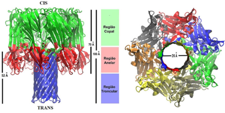 Figura 2. Modelo do nanoporo formado pela alfatoxina. A direita visão superior com cada subunidade representada em diferentes cores. A esquerda visão lateral com cada domínio representado em três cores. Na área central, os retângulos empilhados em três cores específicas correspondem a espessura aproximada de cada domínio. A região troncular se insere completamente na membrana lipídica, e fica posicionada com a entrada convencionalmente denominada TRANS no mesmo plano da superfície da membrana. A região copal não se insere na membrana lipídica e a entrada CIS do nanoporo fica distante (~50 Å) da superfície da membrana. A região anelar (parte inferior da copa) fica ancorada na membrana. As barras verticais indicam o comprimento de cada região e o diâmetro do nanoporo. Adaptado do Protein Data Bank (pdb), código 7AHL