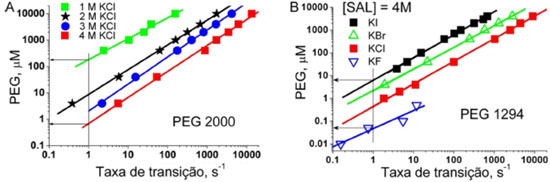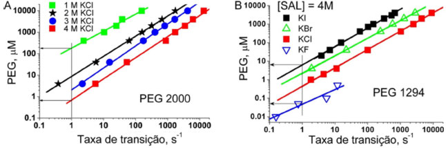 Figura 4. Influência da concentração e composição da solução na sensibilidade do nanoporo da alfatoxina. A) O valor da concentração do polietilenoglicol (PEG 2000) é menor (0,7 µmol L-1) na presença da solução iônica de elevada concentração de KCl (4 mol L-1), portanto, o aumento da concentração do KCl de 1 para 4 mol L-1, aumentou a sensibilidade do nanoporo em aproximadamente 214 vezes. Adaptado da Ref. 98. B) O valor da concentração do polietilenoglicol (PEG 1294) é menor (0,05 µmol L-1) na presença da solução iônica de fluoreto de potássio (4 mol L-1), portanto, a substituição do iodeto pelo fluoreto aumentou a sensibilidade do nanoporo em aproximadamente 130 vezes. As setas horizontais indicam o menor valor de concentração do analito (PEG), considerando a frequência dos bloqueios na corrente iônica, maior ou igual a 1 Hz como indicado pela linha vertical. Adaptado da Ref. 100