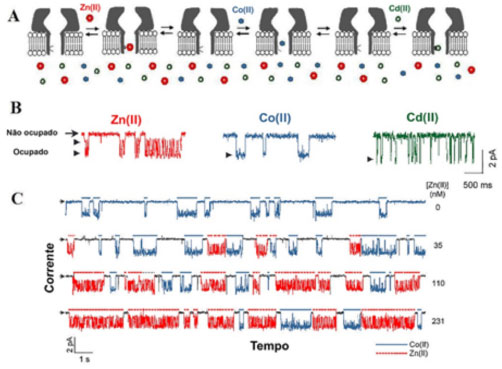 ![]() Figura 5. Capacidade do nanoporo da alfatoxina em detectar íons divalentes. (A) Representação esquemática do sítio de ligação introduzido por mutação no interior do nanoporo da alfatoxina. As setas indicam a interação de um íon (círculo cheio ou vazio) com o sítio de ligação. (B) Registros de bloqueios da corrente iônica, característicos de cada íon (Zn+2, Co+2, Cd+2). Cada registro resulta de um experimento em que apenas um dos íons foi adicionado à solução eletrolítica. (C) Registros da corrente iônica na presença de apenas íons de Co+2 na solução eletrolítica (primeiro traçado). Os três traçados inferiores representam sequencialmente os registros da corrente iônica à medida que se aumentou a concentração do Zn+2 para 35, 110 e 231 nmol L-1, respectivamente. As linhas cheias e tracejadas indicam o perfil de bloqueio na corrente, característico do Co+2 ou Zn+2, respectivamente. Adaptado da Ref. 25
