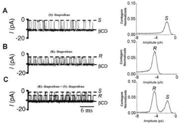 ![]() Figura 6. Capacidade do nanoporo da alfatoxina na discriminação de moléculas enantioméricas. A β-ciclodextrina (βCD) foi acoplada na região mais estreita do nanoporo da alfatoxina mutante, diminuindo ainda mais seu diâmetro, portanto, reduz a corrente iônica que passa através do nanoporo como indicado pela linha contínua nos registros. a) Registro dos bloqueios na corrente iônica característica do (S)-ibuprofeno. A linha tracejada indica a amplitude dos bloqueios; b) Registro dos bloqueios na corrente iônica característica do (R)-ibuprofeno; c) Registro dos bloqueios da corrente iônica de ambas as formas enantioméricas do ibuprofeno. Ao lado direito de cada registro, os respectivos histogramas de amplitude dos bloqueios da corrente iônica. Nota-se claramente que o nanoporo é capaz de discriminar as formas enantioméricas do ibuprofeno. Adaptado da Ref. 27