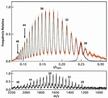 ![]() Figura 7. Nanoporo da alfatoxina como espectrômetro de massas. Espectro de massa (superior) para o polietilenoglicol (PEG 1500, Mr=1500 g/mol) polidisperso obtido com o nanoporo unitário comparado ao espectro de massa (inferior) obtido pelo MALDI-TOF. Os histogramas representam o valor médio da corrente para cada amplitude de bloqueio referente a cada molécula do polímero. Os números na parte superior em cada "pico" do histograma indicam a quantidade de monômeros do etilenoglicol em cada molécula do polímero. Os maiores valores de I/Iopen correspondem às moléculas de PEG de menor massa molecular. O I indica o valor de corrente iônica através do nanoporo quando este é ocupado pelo polietilenoglicol, e Iopen é o valor de corrente quando não há moléculas de PEG no interior do nanoporo da alfatoxina. O "pico" indicado pelo número 28 corresponde a análise da amostra de polietilenoglicol (PEG 1294) monodisperso. No MALDI-MS devido ao processo de desorção e ionização, cada molécula do PEG perde um O ou OH. Adaptado da Ref. 18