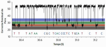 Sequenciador de ácido desoxirribonucléico O uso de nanoporos para o sequenciamento de biopolímeros foi proposto há mais de uma década, com a primeira demonstração experimental da translocação de ácido desoxirribonucléico de fita simples (ss-DNA) através do nanoporo proteico da alfatoxina.105 Uma vantagem importante dessa abordagem em relação aos métodos de sequenciamento por síntese é que, além de ser uma técnica mais direta, ela apresenta uma inerente capacidade de leitura bidirecional do ss-DNA, possibilitando que a mesma fita de DNA seja sequenciada novamente.106,107 A tecnologia de detecção baseada em nanoporo possibilitará um sequenciamento de ácidos nucléicos, com maior rapidez de análise e sem a necessidade de marcação ou amplificação do DNA.2,108,109 Nesta tecnologia a fita de ss-DNA sofre um processo de nanoeletroforese translocando-se por meio do nanoporo, gerando bloqueios na corrente iônica característicos de cada base nucleotídica, como representado na Figura 8.2