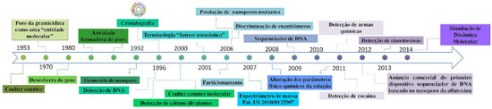Figura 1. Evolução dos estudos visando à aplicação de poros no desenvolvimento de ferramentas analíticas. O counter Coulter foi o primeiro dispositivo prático baseado em um microporo empregado para contagem de partículas de dimensões micrométricas. A primeira demonstração experimental do fluxo de íons através de um poro como uma "entidade molecular" inserida em uma bicamada lipídica ocorreu com o antibiótico peptídico gramicidina, uma vez que este poro é formado a partir de duas moléculas isoladas, uma em cada monocamada lipídica, que ao se acoplarem adquirem a funcionalidade de via de permeação à íons. Na década de 80 ocorreu não somente a descoberta do gene da alfatoxina, bem como os primeiros experimentos demonstrando sua atividade formadora de poros em biomembranas e em bicamadas lipídicas artificiais. No ínicio da década de 90 foi mensurado o valor do diâmetro do nanoporo da alfatoxina. A elucidação da estrutura cristalográfica da alfatoxina na metade da década de 90, foi decisiva para corroborar algumas observações experimentais da ação hemolítica da alfatoxina. Neste mesmo período demonstrou-se pioneiramente que o nanoporo da alfatoxina é permeável e apenas detecta DNA de fita simples. Esta descoberta juntamente com a demonstração eletrofisiológica da aglomeração de sete subunidades proteicas para formação do nanoporo da alfatoxina impulsionaram significativamente a partir do ano 2000, a utilização desse nanoporo como elemento sensor para detecção de outros espécimes químicos, e além disso se introduziu a terminologia molecular counter Coulter, sensoriamento estocástico, sensores estocásticos. Em 2006 realizou-se a produção de alfatoxina mutante, portanto, ocorre a primeira melhoria genética no nanoporo da alfatoxina, a qual permitiu sua utilização como ferramenta para discriminação de moléculas enantioméricas. Neste mesmo ano demonstrou-se que o aumento da força iônica torna máxima a interação polietilenoglicol(PEG)-nanoporo e favorece o particionamento deste polímero no lume aquoso do nanoporo, propiciando melhorias na capacidade de detecção do nanoporo da alfatoxina; resultando no ano seguinte com a primeira demonstração deste nanoporo como espectrômetro de massa. Em 2008 demonstrou-se que o aumento na concentração de um mesmo sal (KCl de 1 mol L-1 para 4 mol L-1) aumenta em aproximadamente 200 vezes a sensibilidade do nanoporo da alfatoxina. Três anos depois se corroborou que não somente o aumento de concentração do sal, bem como a composição da solução iônica, influenciam na sensibilidade do nanoporo; com a demonstração que os sais da série de Hofmeister, especificamente a substituição do KI pelo KF aumentou em aproximadamente 100 vezes a sensibilidade do nanoporo da alfatoxina. A partir de 2010 diversos relatos demonstram academicamente que o nanoporo da alfatoxina pode ser usado para detectar armas químicas, drogas ilícitas, cianotoxinas, porém, somente no final de 2012 ocorre o primeiro anúncio comercial de um sequenciador de DNA baseado neste nanoporo. Devido aos relevantes resultados obtidos na última década propiciaram nos últimos três anos a utilização de simulação de dinâmica molecular para aumentar o entendimento da interação analito-nanoporo da alfatoxina