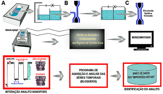 Figura 3. Esquema da montagem experimental do nanoporo da alfatoxina como biossensor estocástico. (A) Desenho da câmara experimental formada por duas hemicâmaras separadas por uma película de Teflon® com um orifício (aproximadamente 40 µm de diâmetro) para a formação da bicamada lipídica plana. (B) Primeira etapa de montagem da monocamada lipídica ocorre com acréscimo de mais solução em um dos compartimentos da câmara experimental. (C) Montagem da segunda monocamada lipídica. A deposição de cada uma das monocamadas lipídicas ocorre com a introdução de mais solução em cada um dos respectivos compartimentos da câmara. Na região central demonstra-se a mesa de amortecimento com a câmara experimental acoplada através de eletrodos à interface eletrônica de aquisição dos registros de corrente iônica. Esta interface é composta por amplificador e filtro passa-baixa conectados ao conversor analógico-digital acoplado a um microcomputador. Na parte inferior encontra-se um quadro da membrana lipídica com um único nanoporo inserido. A entrada e passagem da molécula de analitos (bolinha vermelha) através do nanoporo induzem bloqueios característicos na corrente iônica. A análise das amplitudes e durações dos bloqueios permite a identificação dos analitos; a análise da frequência dos bloqueios permite a quantificação dos analitos. A aquisição, armazenamento e análise das séries temporais (impressão digital) são processadas por um programa dedicado e a identificação do analito é realizada por comparação em um banco de dados de impressões digitais. Este banco de dados é montado com a calibração do sistema e registro de corrente iônica com analitos de alto grau de pureza
