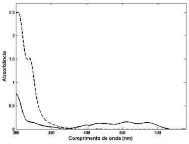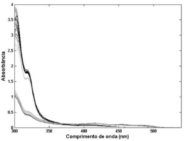 ![]() Figura 1. Espectro UV-Vis de diferentes classes de azeite de oliva ( ) virgem, ( ) extra virgem, ( ) composto