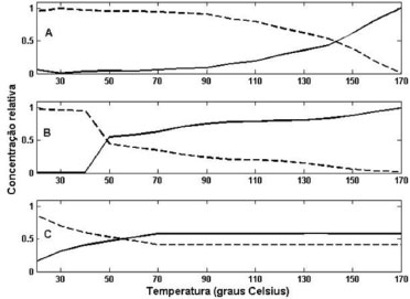![]() Figura 2. Resultados de MCR-ALS para os perfis de concentração de azeite de oliva (A) extra virgem, (B) virgem, (C) composto. ( ) Produtos de oxidação, (----) Tocoferol