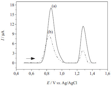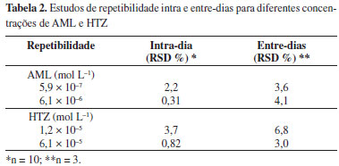 As curvas analíticas obtidas apresentaram regressão linear (r = 0,995 e r = 0,999 para AML e HTZ, respectivamente) para as concentrações analisadas, com as respectivas equações: ![]() O LOD foi calculado pela relação sinal-ruído54,55 obtendo-se limites de detecção de 60,0 nmol L-1 para AML e 2,00 µmol L-1 para HTZ. A fim de avaliar o método proposto quanto a repetibilidade, realizou-se o estudo de repetibilidade intra-dia com dez medidas sucessivas no mesmo dia (n = 10), utilizando-se duas diferentes concentrações de soluções padrão de AML e HTZ. Para a repetibilidade entre-dias utilizou-se os desvios das correntes de pico obtidas para medidas realizadas em três diferentes dias (n = 3), com soluções padrão preparadas diariamente em duas concentrações diferentes de AML e HTZ. Calculou-se o RSD referente a cada concentração (Tabela 2). O método proposto apresenta uma boa repetibilidade, uma vez que foram obtidos RSD menores do que 7,0%.