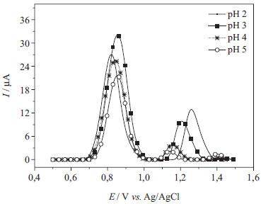O efeito da concentração hidrogeniônica (ou do pH) sobre o comportamento voltamétrico de ambos os analitos também foi estudado utilizando-se o eletrodo de CPT-BDD e a técnica de SWV. Na Figura 3 são apresentados os voltamogramas obtidos para a oxidação simultânea do AML e da HTZ em tampão BR em diferentes valores de pH (2, 3, 4 e 5). Como pode ser observado, para o AML houve um aumento da magnitude do sinal analítico no valor de pH igual a 3, porém, acima deste valor de pH a magnitude do sinal analítico diminuiu. Um comportamento diferente foi observado para a HTZ; um aumento do valor de pH levou a uma diminuição gradativa da magnitude da corrente anódica. Sendo assim, considerando-se o melhor compromisso entre as magnitudes de pico de corrente para ambos os analitos e uma melhor separação dos picos de oxidação (maior resolução), selecionou-se o pH 2 para os estudos posteriores.