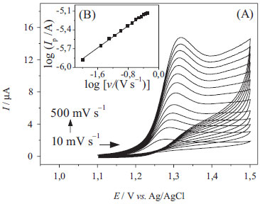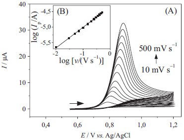 ![]() Figura 5. Voltamogramas cíclicos para (A) HTZ 1,98 × 10-4 mol L-1em diferentes velocidades de varredura de potencial (10, 30, 50, 70, 100, 150, 200, 250, 300, 350, 400, 450 e 500 mV s-1. Inserido: (B) Dependência do logaritmo da corrente de pico com o logaritmo da velocidade de varredura de potencial para a HTZ. Equação da reta: log I = 4,98 + 0,440 log v [HTZ]