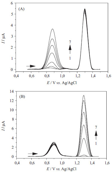 ![]() Figura 6. Voltamogramas de onda quadrada em diferentes concentrações de AML e HTZ. (A) AML (1 a 7: (1) Branco; (2) 0,190; (3) 0,951; (4) 2,82; (5) 4,60; (6) 6,30; (7) 8,80 µmol L-1) com uma concentração fixa de HTZ (4,0 × 10-4 mol L-1) e (B) HTZ (1 a 7: (1) Branco; (2) 4,78; (3) 2,81; (4) 4,59; (5) 6,31; (6) 7,96; (7) 8,77 µmol L-1) com uma concentração fixa de AML (4,0 × 10-4 mol L-1) em eletrólito suporte tampão BR pH = 2 utilizando um eletrodo de CPT-BDD. Condições da SWV: f = 120 Hz, a = 30 mV, ΔEs = 5 mV