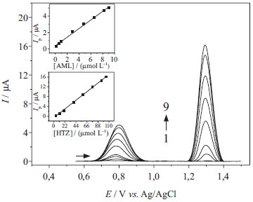 ![]() Figura 7. Voltamogramas de onda quadrada, obtidos para oxidação de AML e HTZ empregando um eletrodo de CPT-BDD em eletrólito suporte tampão BR pH = 2. AML (1 a 9: (1) Branco; (2) 0,200; (3) 0,596; (4) 0,990; (5) 2,91; (6) 4,76; (7) 6,54; (8) 8,26; (9) 9,09 µmol L-1) e HTZ: (1 a 9: (1) Branco, (2) 4,00; (3) 11,9 ; (4) 19,8; (5) 39,2; (6) 58,2; (7) 76,9; (8) 95,2; (9) 100 µmol L-1). Inserido: curvas analíticas. Condições da SWV: f = 120 Hz, a = 30 mV, ΔEs = 5 mV