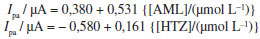 Como a proposta deste trabalho é a determinação simultânea da combinação binária de AML e HTZ, analisou-se a interferência de cada analito na determinação simultânea ao variar a concentração de um analito e manter fixa a concentração do outro. Realizou-se sucessivas adições de AML em diferentes concentrações (0,190 - 8,80 µmol L-1), mantendo-se constante a concentração de HTZ (4,0 × 10-4 mol L-1), Figura 6A. Tanto para as baixas concentrações quanto para as elevadas, a HTZ não interfere na determinação de AML, pois a corrente de pico da HTZ se manteve constante com desvio padrão relativo (RSD) de 2,18%.