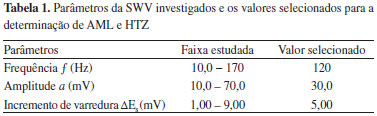 Para avaliar se o processo de oxidação da HTZ é controlado por difusão ou adsorção das espécies, construiu-se também um gráfico de log Ip vs. log v, Figura 5B. Verificou-se uma relação linear (r = 0,998) entre log Ip e log v, com coeficiente angular da reta de 0,44. De acordo com a literatura,57 tal resultado, próximo a 0,5 (valor teórico para sistemas controlados por difusão), indica que o processo de oxidação da HTZ na superfície do CPT-BDD deve ser controlado por um processo difusional das espécies. Além disso, o gráfico de Ip vs. v1/2 mostrou-se linear (r = 0,993), portanto, a oxidação da HTZ na superfície do CPT-BDD é controlada por difusão, como já relatado por outros autores.25,32 Análogo ao cálculo do número de elétrons do AML, anteriormente apresentado, calculou-se o número de elétrons envolvidos no processo de oxidação da HTZ. Para cada velocidade de varredura de potencial foi obtido um valor de Ep - Ep1/2, onde o valor médio foi de 38 mV. Assim, utilizando-se a equação 157 obteve-se um valor de αn = 1,2. Considerando α = 0,5 (valor típico para compostos orgânicos quando não se tem o valor experimental calculado),59 o resultado para n foi igual a 2,4 (aproximadamente 2). Deste modo, conclui-se que a oxidação da HTZ sobre o eletrodo de CPT-BDD envolve dois elétrons por molécula do analito e o mecanismo proposto já encontra-se na literatura.24,25,37 Determinação voltamétrica simultânea de AML e HTZ e aplicação do método proposto na determinação de amostras de urina Avaliou-se o efeito dos parâmetros experimentais da SWV sobre o potencial de oxidação e a intensidade da corrente de pico na determinação simultânea de AML e HTZ a fim de otimizar cada parâmetro da técnica (Tabela 1). Para a otimização de tais parâmetros levou-se em consideração a estabilidade, a magnitude da corrente de pico (sinal analítico), repetibilidade e separação entre os potenciais de oxidação (resolução) de AML e HTZ.