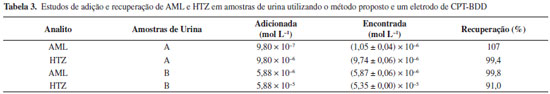 Estudou-se a seletividade do método proposto, investigando o comportamento voltamétrico de AML e HTZ na presença de ureia na concentração de 1,0 × 10-5 mol L-1, um metabólito importante encontrado na urina. As razões entre as concentrações de AML/HTZ: interferente estudadas foram de 1:1 e 1:10. Analisando-se os resultados obtidos (não apresentados), concluiu-se que essa substância não interfere de forma significativa (inferior a ± 10%) na determinação dos analitos em urina. Determinação simultânea de AML e HTZ em urina Para a aplicação do método proposto realizou-se a determinação em urina sintética dopada com duas diferentes concentrações de AML e HTZ. Três determinações foram realizadas para cada concentração e o RSD calculado. As concentrações de AML e HTZ nas amostras de urina foram calculadas pelo método de interpolação na curva analítica, empregando-se as equações obtidas anteriormente para cada uma das curvas analíticas, obtendo-se assim os valores recuperados para cada concentração. Os resultados de adição e recuperação obtidos para as amostras de urina dopadas estão apresentados na Tabela 3.