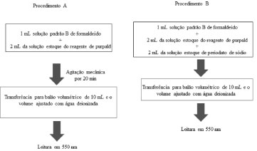 ![]() Figura 1. Procedimentos de derivação para o método do purpald. Procedimento A: sem adição de periodato e Procedimento B: com adição de periodato