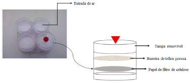 Amostragem Amostragem passiva Para a coleta de formaldeído foram utilizados os amostradores de plástico (Millipore®), desenvolvidos por Garcia, Allen e Cardoso.20 Os amostradores possuem formato cilíndrico com as seguintes dimensões: 3,3 cm de altura e 1,9 cm de raio. Um papel de celulose, (Watman 41), do mesmo tamanho e formato do amostrador, impregnado com a solução adsorvente, foi utilizado como superfície sólida de coleta. O sistema de amostragem era constituído por quatro amostradores, três desses amostradores permaneceram abertos durante o período de coleta e um permaneceu fechado (controle). Os amostradores foram expostos em três diferentes ambientes fechados, por um período de 24 h sem nenhum tipo de acondicionamento, simplesmente o conjunto foi colocado em cima da bancada, no caso da sala de coleções, e em cima da mesa para as salas dos professores e secretária, com a superfície de contato (filtros impregnados) para cima. Cabe mencionar que nenhum dos ambientes avaliados possuíam sistema de ar condicionado. (Figura 2).