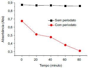 ![]() Figura 3. Estabilidade do método purpald. Padrão de formaldeído 1,0 mg L-1. Reação com e sem a adição de periodato de sódio 33 mmol L-1. Leituras de absorbância em 550 nm