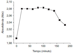 ![]() Figura 4. Estabilidade do método da acetilacetona. Padrão de formaldeído 10 mg L-1. Leituras de absorbância em 412 nm