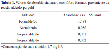 Com base na Figura 3 foi possível observar um decréscimo na intensidade de absorbância, ao longo do tempo, quando o NaIO4 é adicionado ao meio reacional. Como o cromóforo formado mostrou-se mais estável na ausência do agente oxidante, a reação de derivação para as próximas etapas foi feita sem a adição de periodato. O processo de agitação mecânica de 20 min mostrou-se adequado para a etapa de oxidação necessária para completar a reação de derivação. Comparação de desempenho entre os métodos Desde que o único método que necessitou de ajustes na etapa de derivação foi o purpald, a próxima etapa consistiu em uma avaliação comparativa entre os métodos com relação à seletividade, linearidade, precisão, precisão intermediária, limite de detecção (LD), limite de quantificação (LQ) e estabilidade do cromóforo formado. Cabe ressaltar que os parâmetros de validação foram feitos com base na literatura.22 Seletividade A reação de condensação envolvendo amônia e acetilacetona é específica para formaldeído e acetaldeído, não reagindo com o grupamento cetona. As aminas podem competir com amônia na reação, embora geralmente a taxa de reação seja muito baixa.23 Com relação ao MBTH, de acordo com a literatura14 ele reage com várias classes de compostos para formar produtos coloridos, como: aminas aromáticas, iminas heterocíclicas, carbazóis, azo corantes, bases de Schiff e compostos contendo o grupo p-hidroxiestiril. Porém, como muitos desses compostos não se apresentam no estado gasoso ou não são solúveis em água, a determinação de aldeídos alifáticos solúveis em água não sofre interferência desses compostos. A reação é altamente sensível para aldeídos, porém não seletiva para formaldeído, uma vez que ocorre reação com outros aldeídos, como o acetaldeído e propionaldeído. Entretanto, a sensibilidade diminui em função do aumento da cadeia carbônica do aldeído.13,14 O método de purpald é sensível e específico para formaldeído, uma vez que cetonas, ésteres e ácido fórmico, espécies comumente encontradas em amostras de ar, não reagem com o purpald para a formação de compostos coloridos.24 Outros aldeídos como acetaldeído, propionaldeído e valeraldeído reagem com purpald, mas a sensibilidade, quando comparada à reação com formadeído, é muito baixa (Tabela 1).