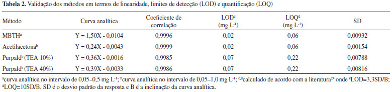 Linearidade Para estabelecer a linearidade dos métodos, foram construídas curvas analíticas, para o método MBTH ((n=5) no intervalo de concentração de 0,05-0,5 mg L-1 e para a acetilacetona e purpald (n=7) no intervalo de concentração de 0,05-1,0 mg L-1. A escolha do intervalo de concentração foi feita com base no método de referência14 do MBTH e o intervalo foi ampliado para os métodos da acetilacetona e purpald, uma vez que os melhores resultados foram obtidos nessa faixa de concentração. Os resultados estão apresentados na Tabela 2.
