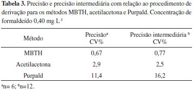 Os parâmetros estatísticos apresentados na Tabela 2 indicam que todos os métodos apresentaram boa linearidade (r > 0,998) na faixa de concentração avaliada, sendo que os métodos do MBTH e da acetilacetona apresentaram um desempenho similar tanto para os limites de detecção (LOD) quanto para os limites de quantificação (LOQ). Precisão e precisão intermediária As precisões dos métodos foram determinadas em relação ao procedimento de derivação (n=6), realizado no mesmo dia, da solução padrão de formaldeído 0,40 mg L-1. A determinação das precisões intermediárias, que diz respeito a variações aleatórias, foi feita em relação ao procedimento de derivação, da solução padrão de formaldeído 0,40 mg L-1, em dias consecutivos (n=12). Os resultados estão apresentados na Tabela 3.