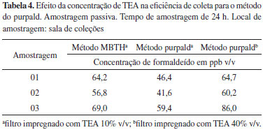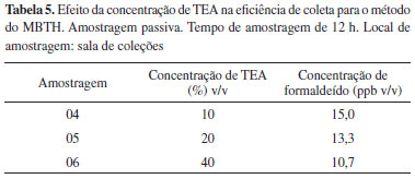 Custo das análises Se a comparação de custo entre métodos for feita em termos de agente derivatizante, não existe uma diferença significativa de preço entre o MBTH, acetilacetona e purpald (considerando utilizar reagentes com alto grau de pureza). A diferença de custo entre os métodos aumenta quando são avaliados todos os reagentes utilizados para cada método específico. O mais caro é o método da acetilacetona e o mais barato o método do MBTH. Avaliação do método de amostragem Eficiência de coleta dos amostradores passivos As amostragens avaliando os diferentes reagentes foram feitas na sala de coleções. A sala de coleções foi selecionada para as amostragens porque esse ambiente apresenta algumas características peculiares como ausência de boa ventilação, proteção contra a luz solar e a possibilidade de altas concentrações de formaldeído presente no ambiente por ocorrerem práticas que requerem constantemente o uso de formol, como por exemplo, a taxidermia e também a identificação de amostras fixadas. Alguns estudos preliminares25 para o MBTH já tinham evidenciado que a solução de TEA era melhor como solução coletora do que a solução de MBTH 0,05% m/v para as amostragens passivas. Para o método do purpald, a escolha inicial para a impregnação dos filtros foi feita com base na literatura.21 Para o método da acetilacetona, desde que a coleta feita com amostragem ativa (impinger) utilizando como solução adsorvente água deionizada (resultados não mostrados) mostrou baixa eficiência de coleta, a impregnação do filtro foi feita com a solução reagente de Nash. Vale ressaltar que não foi utilizada uma atmosfera padrão de formaldeído, uma vez que o método do MBTH mostrou que amostragens simultâneas de 12 h utilizando amostragem passiva versus amostragem ativa produziram resultados similares para o ambiente avaliado.25 A concentração de formaldeído encontrada para o ambiente analisado foi de 47,1 ppb v/v para o método do MBTH; 35,6 ppb v/v para o método do purpald e 16,3 ppb v/v/ para o método da acetilacetona. Como pode ser observado, o maior valor de concentração de formaldeído foi obtido pelo método do MBTH. Esse comportamento pode estar relacionado com o fato do MBTH reagir com outros aldeídos, portanto o método avalia a concentração total de aldeídos expressa como formaldeído ou a concentração de TEA (10% v/v) utilizada para a coleta do método do purpald não foi adequada. Cabe mencionar que, diferentemente do MBTH, o purpald quando reage com outros aldeídos como acetaldeído e propionaldeído apresenta baixos valores de absorbância. O método da acetilacetona apresentou a menor concentração (menos do que a metade quando comparada com a concentração encontrada para o reagente purpald), o que pode ser um forte indicativo de baixa eficiência de coleta. Foi feito um estudo para avaliar a influência da concentração de TEA no processo de coleta da amostra. Para o método do purpald, o aumento da concentração de TEA mostrou-se mais eficiente para a coleta de formaldeído, o que está de acordo com a literatura.21 Os valores das concentrações encontrados para amostragem 01 entres os métodos MBTH e purpald estão em concordância. A concentração média da amostragem 03 foi superior ao método do MBTH, o que pode ser um indício de contaminação da superfície reacional (Tabela 4).