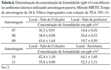 Todos os métodos apresentaram vantagens e desvantagens tanto com relação ao procedimento de derivação quando ao procedimento de coleta da amostra. O método da acetilacetona mostrou como principal desvantagem a etapa de coleta, enquanto que o método do purpald apresentou uma variação significativa de repetibilidade na etapa de derivação. Apesar do método do MBTH expressar a quantidade total de aldeídos na forma de formaldeído, ele apresentou excelente desempenho em todos os parâmetros avaliados: validação, facilidade no preparo do reagente, no procedimento derivação, custo da análise e na etapa de amostragem. Determinação de formaldeído em ambientes fechados utilizando amostragem passiva Desde que a utilização de amostradores passivos impregnados com TEA 10% v/v utilizando o método do MBTH mostrou-se apropriado para ambientes fechados, foram realizadas amostragens em diferentes ambientes fechados no Campus da Universidade. Os resultados estão representados pela Tabela 6.