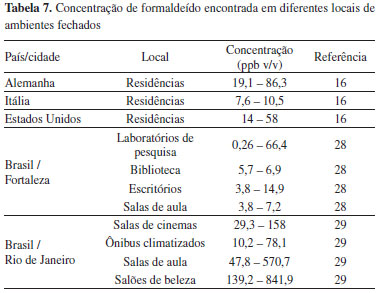 A concentração de formaldeído variou em função da característica de cada local. A sala de coleções é um local com baixas taxas de ventilação e o formaldeído é utilizado para a preservação de espécies e em outros procedimentos laboratoriais. A secretaria é um local novo que apresenta um odor bastante característico (principalmente depois do final de semana, quando o local fica com portas e janelas fechadas) que provavelmente é proveniente da resina de revestimento do piso. A sala de professores é o local que apresentou o menor valor de concentração de formaldeído que pode ser resultante da emissão do imobiliário ou produtos de limpeza utilizados no local. Os valores encontrados não excederam o limite de exposição estabelecido pela legislação internacional (Austrália) que estabeleceu limite máximo de 100 ppb v/v e nem os limites estabelecidos pela legislação brasileira para ambientes de trabalho (1,6 ppm v/v até 48 h/semana).26,27 Em comparação com os níveis encontrados em outros países e até mesmo em estudos realizados no Brasil, não foram observados valores muito superiores aos locais avaliados28,29 (Tabela 7).