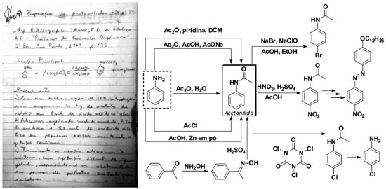 Figura 1. Página de caderno de laboratório de um quarto de século atrás descrevendo a síntese da acetanilida executada por um dos autores (SC) e exemplos de preparação e usos da acetanilida em miniprojetos de síntese para aulas10-23