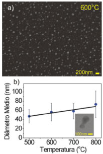 ![]() Figura 1. a) imagem por microscopia eletrônica de varredura de nanopartículas de cobre geradas por tratamento térmico de filme fino (2 nm) de cobre à 600 ºC. b) gráfico do diâmetro médio das nanopartículas em funçao da temperatura de tratamento térmico; a figura inserida ilustra a junçao de nanopartículas em tratamento térmico a 800 ºC